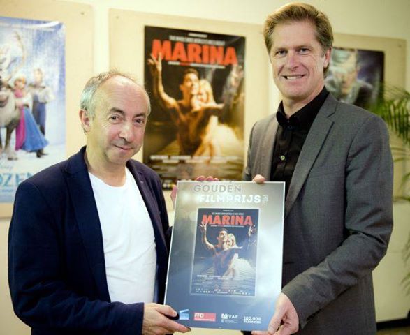 Natuurlijk kon Peter Craeymeersch dit fotomoment niet zomaar aan zich voorbij laten gaan. De grote baas van het Filmfestival van Oostende staat graag op foto’s en laat steevast de affiches inlijsten van de Vlaamse films waarvan het bezoekersaantal op veel nullen eindigt. En dat met de steun van het VAF. Wat die steun inhoudt is ons niet meteen duidelijk. Misschien betaalt het VAF de kosten voor het inlijsten van de affiche. Als er 100.000. toeschouwers geweest zijn, zoals nu met ‘Marina’ het geval is, krijgt de kader die hij overhandigt de naam mee van de ‘Gouden Award’. Zijn het 200.000. toeschouwers dan heet de trofee de ‘Platina Award’ en voor 400.000. toeschouwers plakken Peter en zijn kompanen graag de term ‘Diamanten Award’ op de affiche.